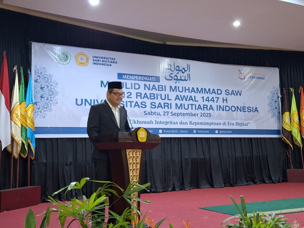 Medan — Universitas Sari Mutiara Indonesia (USM Indonesia) menggelar peringatan Maulid Nabi Muhammad SAW 12 Rabi’ul Awal 1447 H yang jatuh pada Sabtu, 27 September 2025. Acara ini dihadiri langsung oleh Ketua Yayasan Sari Mutara Medan, jajaran pimpinan rektorat, dekan fakultas, serta para ketua program studi. Suasana berlangsung khidmat sekaligus