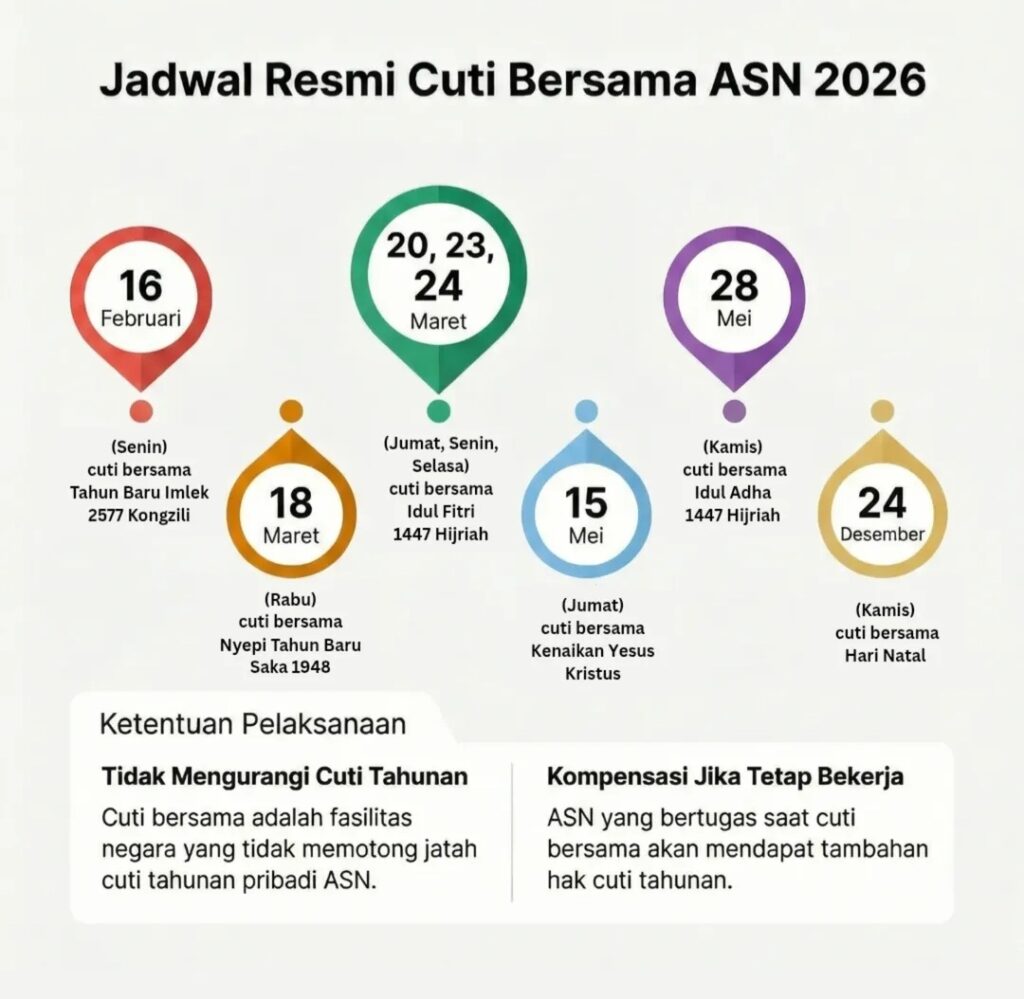 Penetapan cuti bersama tahun 2026 ini menjadi panduan penting bagi instansi pemerintah dalam menyusun jadwal kerja, memastikan layanan publik tetap berjalan, sekaligus membantu ASN merencanakan waktu istirahat dan kegiatan bersama keluarga.