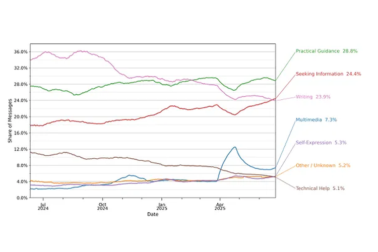 Kategori ini adalah jenis percakapan yang meminta ChatGPT menyelesaikan tugas seperti menulis draf, membuat rencana, atau menulis kode. Sementara itu yang terakhir ada kategori “Expressing” dengan porsi total percakapan sekitar 11 persen. Percakapan kategori ini menggambarkan penggunaan ChatGPT sebagai ruang refleksi pribadi, eksplorasi ide, hingga hiburan. Topik yang paling banyak dibicarakan Lebih lanjut, OpenAI juga menguak beragam topik utama yang sering dimasukkan pengguna ke dalam ChatGPT. Topik paling populer adalah Practical Guidance yang memiliki porsi sekitar 28,8 persen.