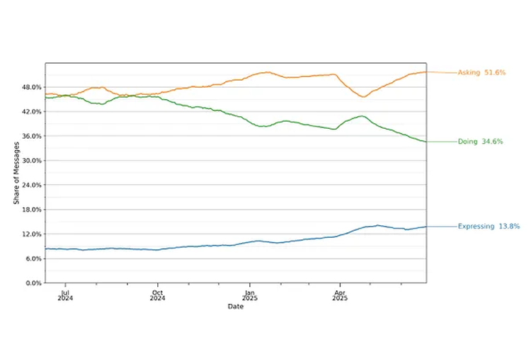 Di bawah Asking, ChatGPT menyebut 40 persen total percakapan di chatbot ini dikategorikan sebagai “Doing”.